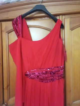 Precioso vestido de fiesta, ideal para una ocasión especial. Es de color rojo y tiene un diseño elegante y favorecedor. - Escote asimétrico. - Detalle de rosa en el hombro, ajustable. - Tejido satinado. - Comprado en una boutique, me lo he puesto 2 veces, la tela es de muy buena calidad, no se arruga. - Se puede lavar y planchar, se recomienda limpieza en seco y no secadora. - El único desperfecto las tiras para colgarlo en percha que se las quité. - La talla pone 44, pero diría que es una 40-42, queda ajustado.