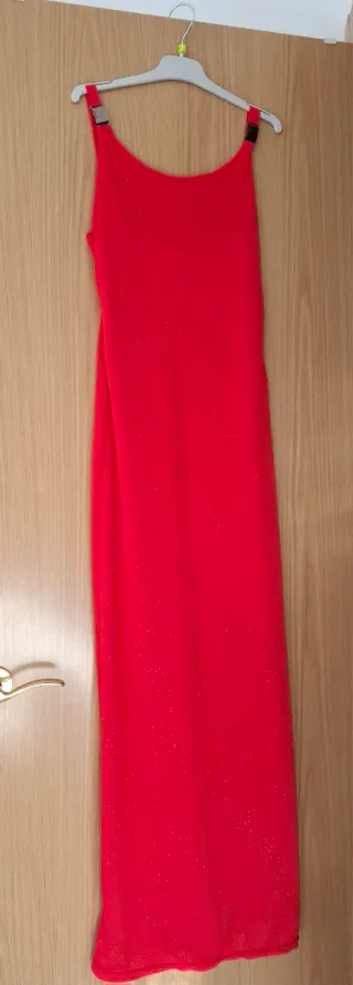Vestido largo de fiesta en color rojo, con un tejido que presenta un sutil brillo. - Diseño ajustado. - Tirantes con detalle metálico que se pueden soltar - Largo hasta el suelo y abertura lateral hasta la rodilla