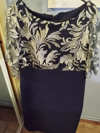 Elegante vestido de fiesta para mujer con detalles brillantes. Talla L (correspondencia según tallas de El corte Inglés con la talla 44). - Cuerpo superior con pedrería y detalles dorados. - Falda larga y fluida. - Manga corta con volantes. Precio super rebajado respecto al precio original. Es elegante, ligero y cómodo.