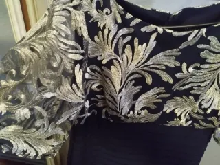 Elegante vestido largo negro con un estampado en relieve. Aunque pone talla 44 da una 40 - Diseño con tirantes finos. - Escote con detalle.