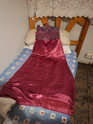 Elegante vestido de fiesta largo, ideal para eventos especiales. De 3 piezas: chal, corpiño de encaje con pedrería en color rosa fucsia. FALDA con un poco de cola por detrás y más corta por delante de raso con volantes de tul por dentro dando volumen asomando un poco por delante. Talla 46 MUY NUEVO USADO UNAS HORAS LAVADO Y PLANCHADO SIN ROZES NI ARAÑAZOS - Cuerpo superior con detalles florales y pedrería. - Tirantes finos. Cintura 86cm Caderas 122cm ALTA COSTURA MUY ELEGANTE Se entrega en persona Visita mi página para ver otras ofertas