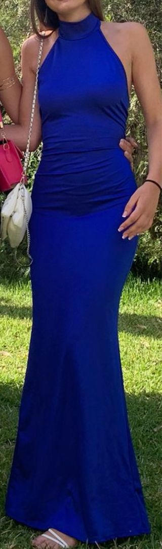Elegante vestido largo de fiesta. - Diseño de cuello alto y espalda descubierta. - Tejido elástico y drapeado en la cintura. - Corte sirena que realza la figura.