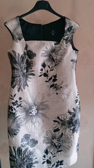 Elegante vestido de fiesta con un estampado floral en tonos grises y blancos. Su diseño es ideal para eventos especiales. - USADO SÓLO UNA VEZ PARA UNA BODA, LAVADO Y DESINFECTADO. - Cubrehombros azul marino a juego. - Diseño sin mangas. - Cuello cuadrado. - Tejido con textura.