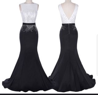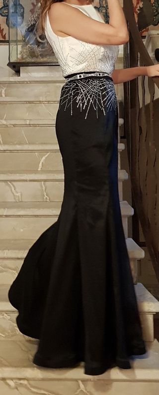 Elegante vestido de fiesta con un diseño bicolor. - Cuerpo superior blanco con detalle de lazo.(La parte superior delantera es guateada) - Cintura marcada en negro. - Falda larga negra.