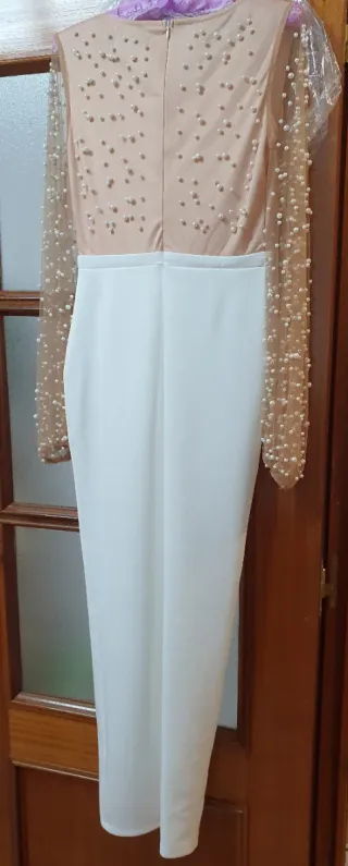 Elegante vestido de fiesta y ceremonia con detalles de perlas. - Cuerpo superior con escote redondo y manga larga. - Mangas de tul semitransparente adornadas con perlas. - Falda blanca con drapeado asimétrico. - Cierre de cremallera en la espalda.