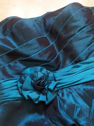 Bonito vestido de fiesta de color verde azulado con escote de palabra de honor. Puesto queda muy bien y muy fino. Ha sido usado en un par de ocasiones, por lo que está en muy buen estado. La talla es aproximadamente una 40-42.