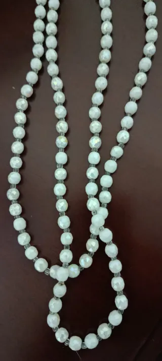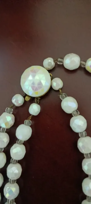 Elegante collar con cuentas de cristal. Tiene dos vueltas y un broche muy original. Es de los años 60, ideal para fiestas con vestidos y blusas escotados. - Diseño largo y delicado. - Cuentas facetadas que reflejan la luz.