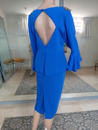 - Vestido de madrina o fiesta de caracterizado por un estilo elegante y formal, ideal para eventos especiales como bodas o ceremonias. Características del Diseño Color: Azul intenso (a menudo descrito como azul cobalto, ultramar o turquesa según el tejido). Cuerpo: Presenta un escote redondo o caja y mangas francesas (3/4) que aportan un aire clásico y refinado. - Cinturilla con aplicaciones que definen la silueta y añaden un acabado lujoso. Falda: De corte largo y recto , con efectos de "abrigo" o capas que proporcionan movimiento e impecable caída. - La capa de tres cuartos deja paso a un vestido sin manga , de corte entallado