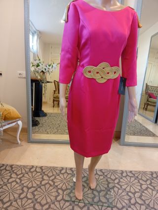 Vestido midi de fiesta en color fucsia, caracterizado por su diseño elegante con manga francesa y detalles decorativos distintivos en hombros así como un cinturón ancho con un detalle de nudo ornamental en color dorado que resalta la cintura. - Vestido de corte recto o tubo, confeccionado en tejido de crepe, con un escote redondo y falda de largo midi. - MEDIDAS pecho 95 cm ,cintura 74 cm , cadera 100 cm