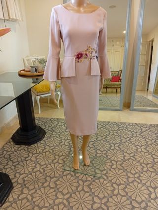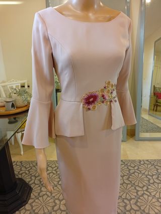 Es una pieza diseñada específicamente para ocasiones especiales como madrinas o invitadas de boda. Detalles del Vestido Diseño: Se trata de un vestido corto de corte peplum en color maquillaje. Características: Presenta un escote redondo, manga francesa con terminación acampanada y un distintivo detalle de aplicación floral en la cintura. Tejido: Está confeccionado en crepe o tussord, materiales que aportan estructura y elegancia a la prenda.
