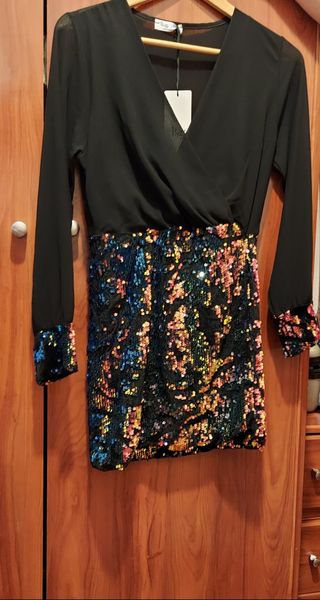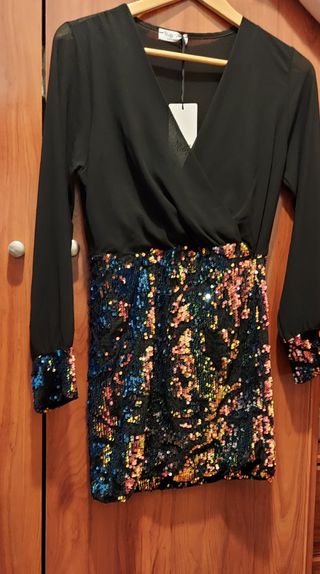 Vestido con lentejuelas brillantes. - Diseño cruzado. - Manga 3/4. - Escote pronunciado. IDEAL PARA FIESTAS.
