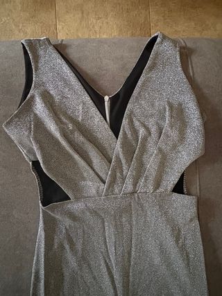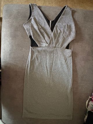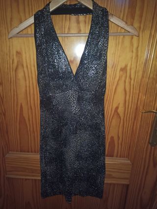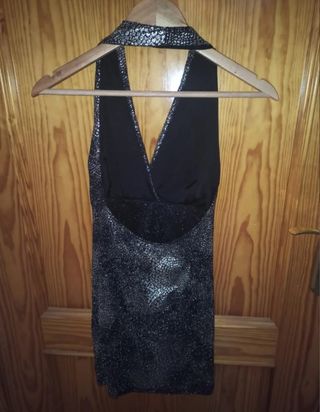 Vestido corto de fiesta muy chulo es talla única pero es como una S (es algo elastico) con relleno en el pecho, plata y negro con espalda al aire perfecto para fiesta o evento.