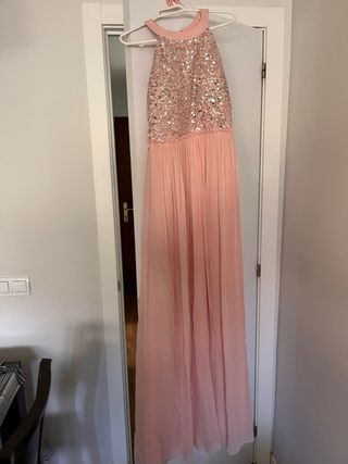 Precioso vestido de fiesta largo, color rosa. Ideal para una ocasión especial. - Diseño elegante y sofisticado. - Confeccionado con lentejuelas brillantes. - Caída fluida y favorecedora. - En perfecto estado, un solo uso. - Regalo zapatos (talla 38) y bolso a juego. - Se puede vender solo el vestido sin complementos.