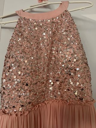 Vestido de fiesta, lentejuelas, color oro rosa.