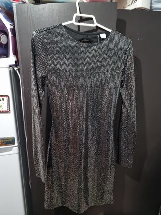 Vestido de fiesta con un diseño brillante y elegante. - Manga larga. - Escote en la espalda con detalle. - Diseño geométrico con lentejuelas. Talla M o una S grande. Una sola vez utilizado.