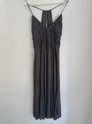 Elegante vestido largo de fiesta. - Diseño con tirantes finos. - Tejido satinado con caída. - Doble capa en la falda.