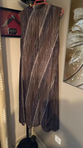 Vestido de fiesta de Adolfo Domínguez con un diseño plisado y estampado de rayas diagonales en tonos marrones y grises. - Diseño plisado vertical. - Estampado de rayas diagonales. - Corte recto.