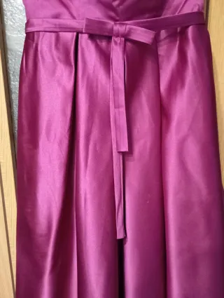 Elegante vestido de fiesta en tono morado. Perfecto para eventos especiales. - Diseño con lazada en la espalda. - Falda con pliegues. - Tejido satinado.