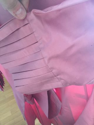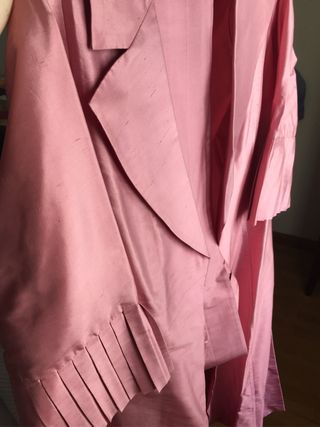 Elegante traje de chaqueta rosa, ideal para eventos y bodas. Su diseño con solapa y detalles plisados en las mangas le da un toque sofisticado. Seda. - Tejido satinado. - Diseño con solapa. - Mangas con detalle plisado. Vestido rosa con encaje dorado Talla una 48 que es 46 Cada cosa 25€