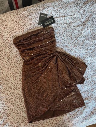 Vestido para eventos, cuerpo de lentejuelas color dorado oscuro , falda de gasa con forro corte en la falda por detrás muy bonito nuevo sin estrenar talla 36 completa