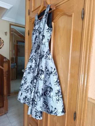 Espectacular Vestido de fiesta o ceremonia, con un llamativo estampado de flores negras sobre un fondo gris plateado, tela de raso de moareg con mucho cuerpo y vuelo, muy favorecedor. Ideal para bailar. Prácticamente nuevo cremallera a la espalda totalmente forrado de la firma F&P que diseña trajes de novia ceremonia cóctel , etc. Talla S medida de cintura 34 cm. entre axilas 40 cm.