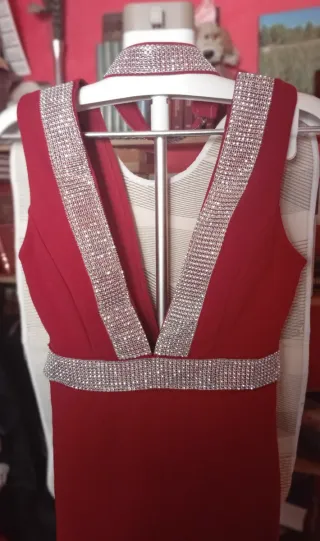 Elegante vestido de fiesta en color rojo, ideal para eventos especiales. Presenta un diseño cruzado en la parte superior y una falda con drapeado. - Cuello alto adornado con pedrería. - Sin mangas. - Cintura marcada. - Falda con detalle drapeado. solo una puesta . En perfectísimo estado. Es un poco elástico. medidas en. fotos. de Largo 1metro.