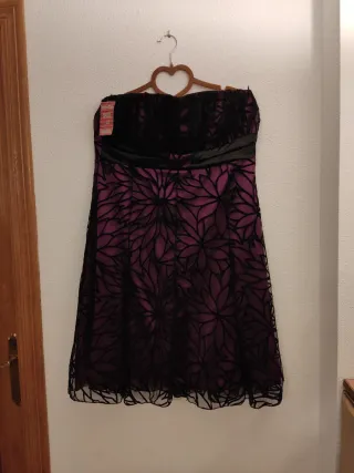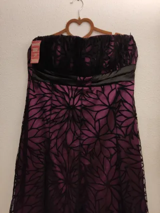 Vestido de fiesta morado con detalle de flores negras. - Diseño palabra de honor. - Cinturón negro. - Falda con estampado floral. - Bajo con acabado de encaje. Purple and black strapless dress size UK 16-18, EU 46, ES 48.