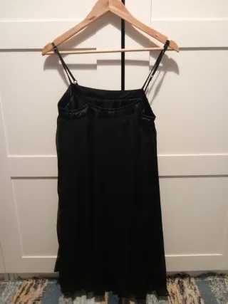 Vestido negro con tirantes finos, ideal para eventos o fiestas. - Diseño elegante. - Largo hasta la rodilla. - Acabado satinado.
