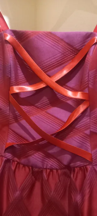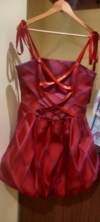 Vestido de fiesta en tono rojo vibrante, con un diseño único. - Tirantes finos con lazo. - Corsé con cordones cruzados en la espalda. - Falda con volumen y detalle de rombos. La talla equivale a una 42, no la 44 que pone la etiqueta