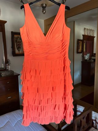 Vestido de fiesta con un vibrante color naranja y un diseño con múltiples gotas de agua e la falda a modo de volantitos: - Escote en V. - Cuerpo fruncido. - Falda con cascada de volantes.