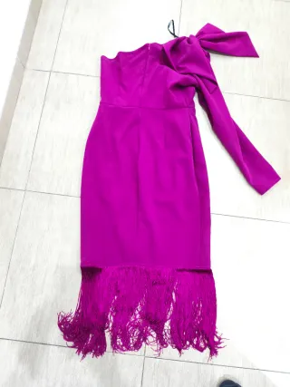 Elegante vestido morado, perfecto para eventos especiales. Destaca por su diseño asimétrico y detalles de flecos. - Diseño de un solo hombro con lazada. - Manga larga. - Falda con flecos en cascada. - Corte ceñido.