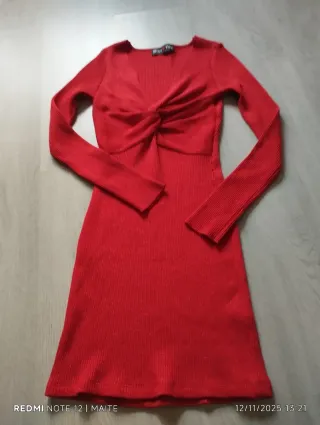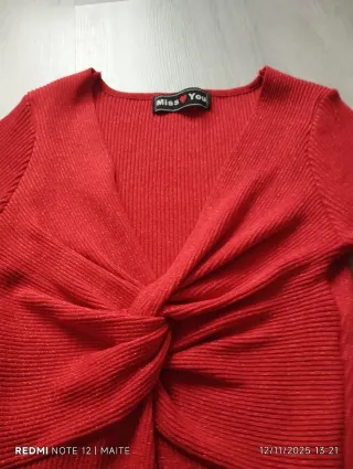 Vestido de fiesta de punto en color rojo, con un diseño elegante y moderno. - Tejido elástico y acanalado. - Detalle de nudo en la parte delantera. - Manga larga. Escote original. Lleva un hilo brillante muy bonito. Largo 80 cm.