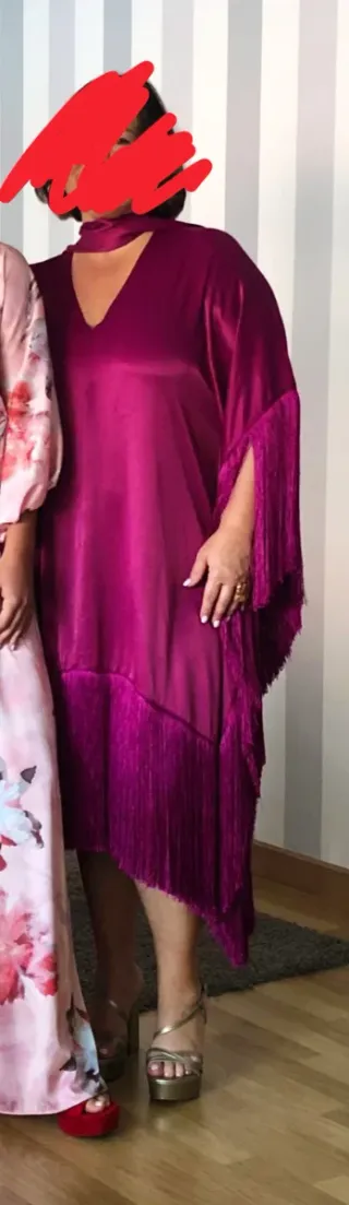Elegante vestido morado, ideal para eventos especiales como bodas o fiestas. - Diseño con escote halter y detalles de flecos. - Tejido satinado con caída. - Corte amplio y favorecedor.