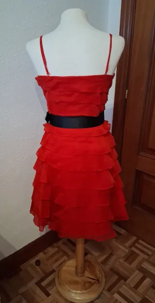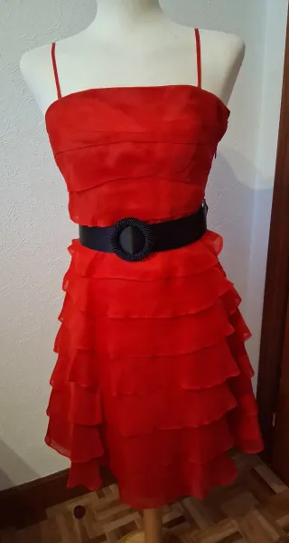 Elegante vestido de fiesta en color rojo, con un diseño de volantes escalonados. - Tirantes finos. - Cinturón negro con detalle de pedrería. - Falda con múltiples capas de volantes. Precio negociable