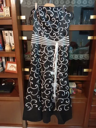 Elegante vestido de fiesta largo con un diseño llamativo. - Diseño strapless. - Estampado de volutas blancas sobre fondo negro. - Detalle de cintas y mariposas en la parte frontal. - se regala torera - pecho 96, cadera 110, cintura 82, largo 133