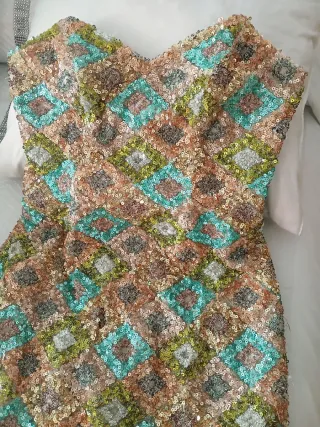 Vestido de fiesta corto con un diseño de lentejuelas brillante y llamativo. - Diseño de rombos en varios colores. - Tejido con lentejuelas. - Estilo strapless. En perfecto estado solo puesto unas horas Diseño único confección a medida