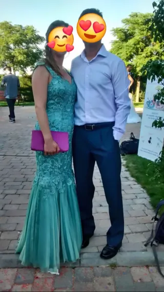Elegante vestido largo para ocasiones especiales. Color verde turquesa. Su diseño es de corte sirena y está confeccionado en encaje, tul y raso. Cremallera en espalda. La talla en el vestido es 44 aunque está arreglado a medida para una talla 40. #boda #comunión #graduación