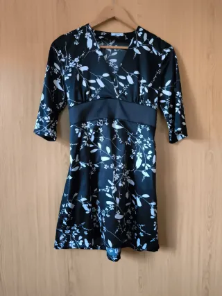 Vestido de fiesta con un bonito estampado floral en blanco sobre fondo negro. El corte es favorecedor y la tela tiene una caída elegante. Corte oriental. Como nuevo. - Diseño de manga tres cuartos. - Cintura marcada con banda de satén. - Escote en V.