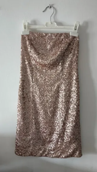 Vestido de fiesta sin tirantes, cubierto de lentejuelas brillantes. - Diseño palabra de honor. - Acabado con lentejuelas. - Artículo nuevo.