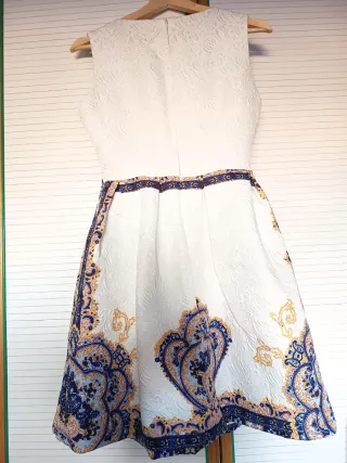 Vestido de fiesta con un diseño llamativo y elegante. - Danity Paris. - Tejido texturizado en blanco. - Estampado paisley en tonos azul y dorado. - Corte a la cintura con falda acampanada. - Sin mangas.