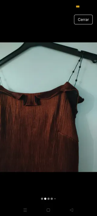 Elegante vestido largo de fiesta en color marrón burdeos . Ideal para eventos especiales. - Diseño con tirantes finos. - Acabado satinado y arrugado. - Largo hasta los pies en forma tubular .con escote en pico en la espalda cremallera y obertura parte trasera muy bonito y impecable