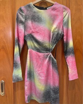 Vestido de fiesta con un diseño vibrante y llamativo. - Tejido con acabado brillante. - Corte moderno con aberturas. - Manga larga.
