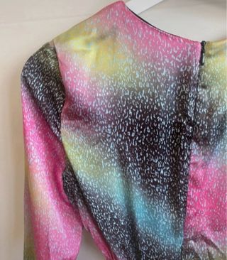 Vestido de fiesta de boutique, usado solo dos veces. Un diseño elegante y llamativo. - Estampado floral multicolor con base rosa. - Tejido satinado con caída. - Escote en V. - Incluye chal .Regalo chaqueta.