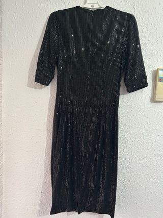 Elegante vestido de fiesta con lentejuelas. - Diseño de manga larga. - Escote pronunciado en la espalda con abertura. - Corte ajustado.