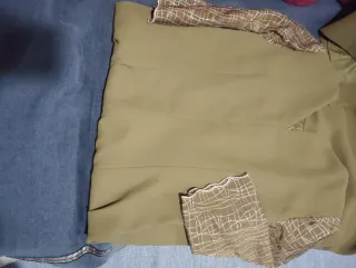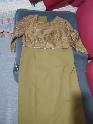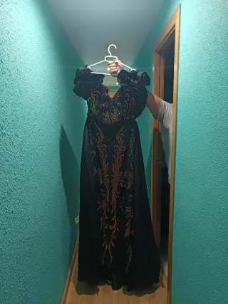 Elegante vestido de fiesta con un diseño único. - Parte superior con tejido transparente y detalles dorados. - Mangas largas con el mismo detalle. - Falda larga y fluida. -blaizer a juego con el vestido que le da un toque de elegancia Talla 46 pero es reducida queda como una talla 44