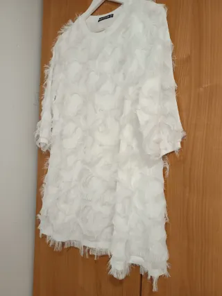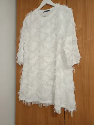 Vestido de fiesta blanco con un diseño original y elegante. - Acabado con flecos texturizados. - Mangas cortas. - Largo hasta la rodilla.