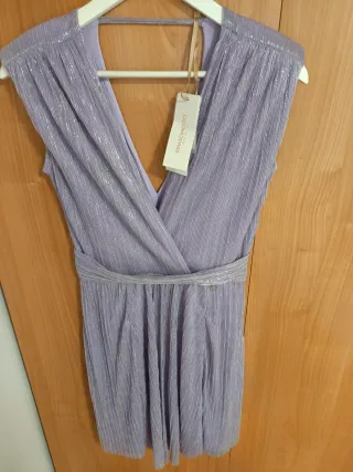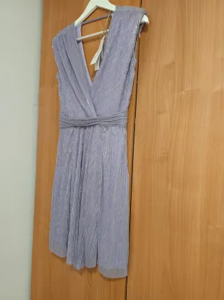 Elegante vestido de fiesta con un diseño brillante. - Color lila con detalles plateados. - Tejido con textura plisada. - Cintura marcada con fruncido. - Escote en V cruzado. - Corte asimétrico en el bajo.