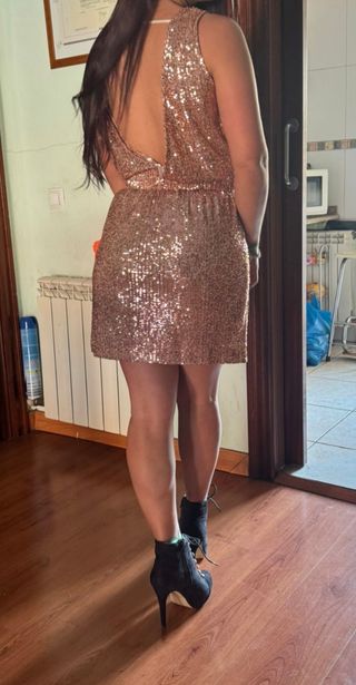 Vestido corto de lentejuelas con un diseño brillante. - Escote en V pronunciado en la espalda. - Cintura elástica. - Falda recta. - Cierre de cremallera.