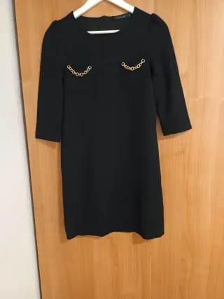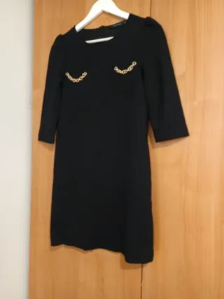 Elegante vestido de fiesta de la marca Twin-Set. - Diseño en color negro. - Detalle de cadenas doradas en la parte superior. - Mangas tres cuartos. - Corte recto. Medidas largo 85 cm , medidas de axila a axila 41 cm medidas de hombro a hombro 33 cm medidas de cintura 44 cm medidas cadera 48 cm. Como nuevo puesto en una ocasión.