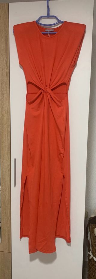 Vestido color coral con aberturas laterales tanto en abdomen como en piernas. Ideal para eventos y celebraciones. A estrenar